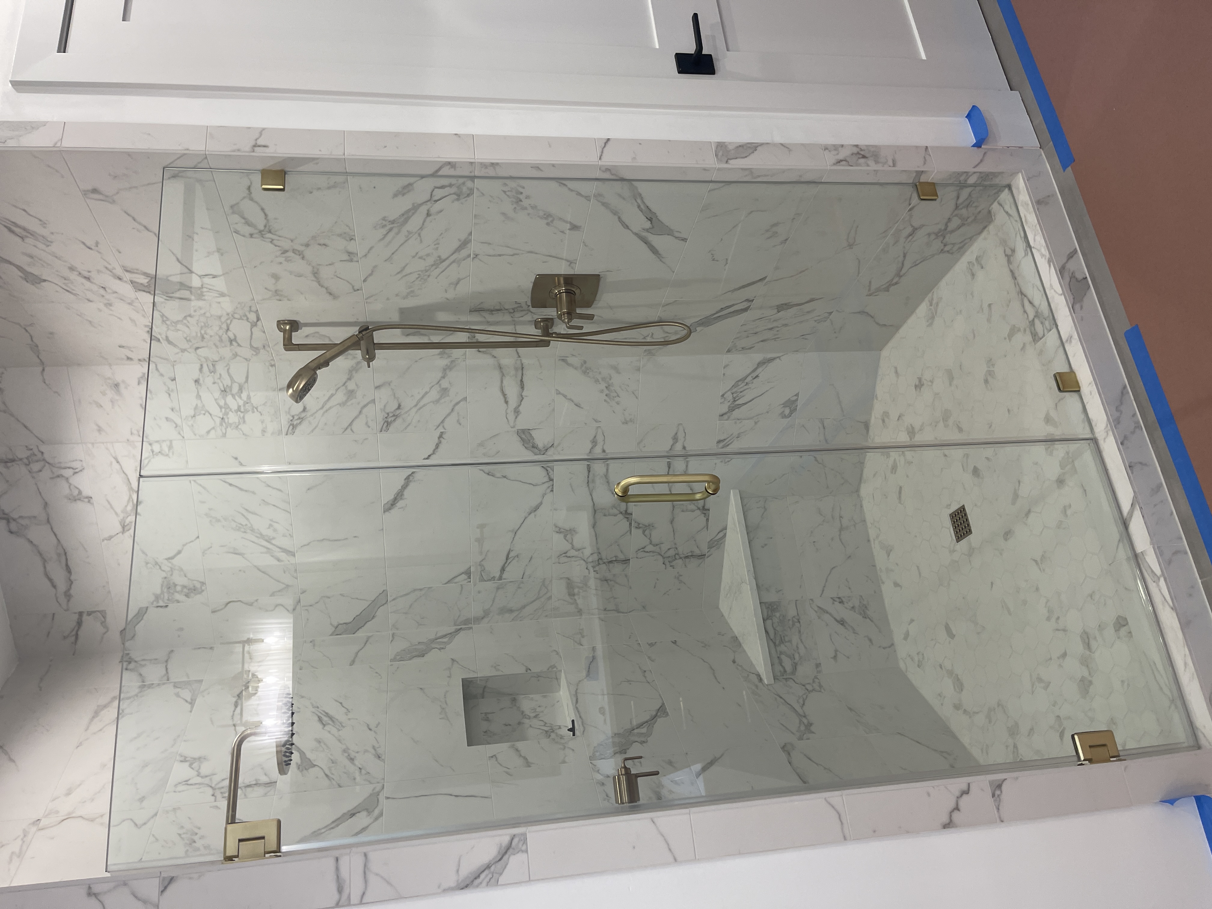 Floor-to-ceiling marble, freestanding tub, frameless glass shower